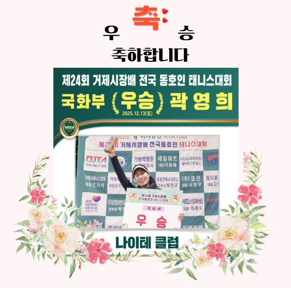 축우승!!! 페이지 정보 작성자 관리자 작성일25-12-16 13:59 조회24회 댓글0건 첨부파일 관련링크 다음글 목록 본문 제24회 거제시장배 전국 동호인 테니스대회 국화부에 출전한 나이테클럽 곽영희 동호인께서 우승 하였습니다. 축하드립니다. 댓글목록 등록된 댓글이 없습니다. 다음글 목록